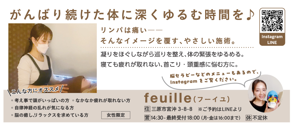 そこで、脳の癒しやリラックスを求めている方にピッタリの『脳セラピー』という施術が、三原市宮沖の『feuille(フーイユ)』にあります。