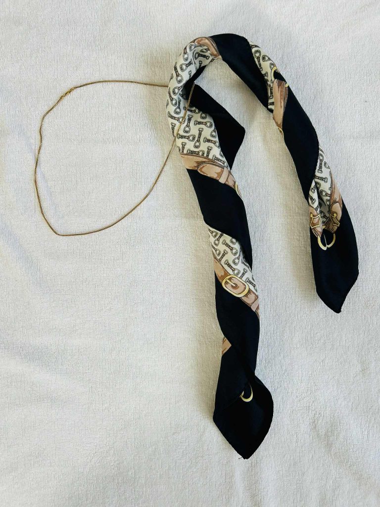 続いて、ネックレスとスカーフを組み合わせた使い方。ネックレスにスカーフを通して首に巻き、正面でスカーフの超先端をもう一度ネックレスに通すと完成です。