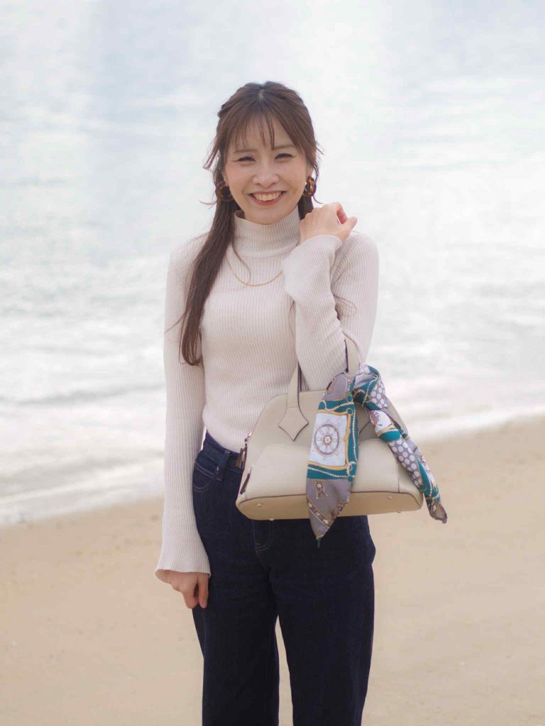最後はアイテムに巻く使い方。こんな風にバッグに巻くだけでコーデのアクセントになりますよね。