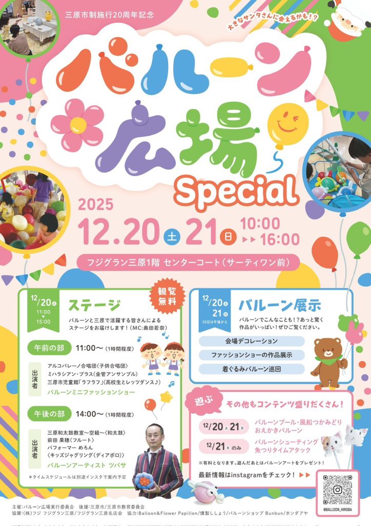 今回、三原市制施行20周年記念事業 としてバルーン広場Specialを開催することとなりました。名前に“Special”がついています。従来の遊ぶコーナーもありますが、初のステージイベント開催、どきどき!わくわく!三原市内でがんばる団体・教室・個人さんと一緒に盛り上げます。バルーンの展示もあります。2日間開催ですが、内容が異なりますのでチラシをよくご確認ください。