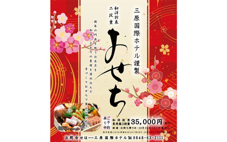 三原国際ホテルのおせち予約承り中! 和洋のこだわりの素材を詰め込んだ手作りおせちで華やかに彩る 和洋折衷 長角箱2段重 35,000円※数量限定■お渡し日 12月31日(水)午前中 三原市内配達 or ホテルお渡し お問 … 続きを読む 数量限定!和洋こだわりの素材を詰め込んだ手作りおせち|三原国際ホテル(三原市城町)